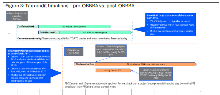 Policy is now the binding constraint. The One Big Beautiful Bill Act (OBBBA) compressed the tax credit qualification window. Projects that begin construction by July 4, 2026, are safe-harbored and eligible to receive full income tax credits (ITC) or production tax credit (PTC) credits under the four-year pathway. Those starting after must reach commercial operation by December 31, 2027 to qualify at all (see figure 3). Foreign Entity of Concern requirements add a decade of annual compliance reviews, with recapture provisions if supply chains fail to meet domestic content thresholds. Tariffs are compounding costs across all technologies, with storage hit hardest, up more than 60% on Chinese battery components. Pre-OBBBA projects that safe-harbored costs in 2023-2024 remain the most bankable, while post-OBBBA developers face tighter structuring and heightened diligence.